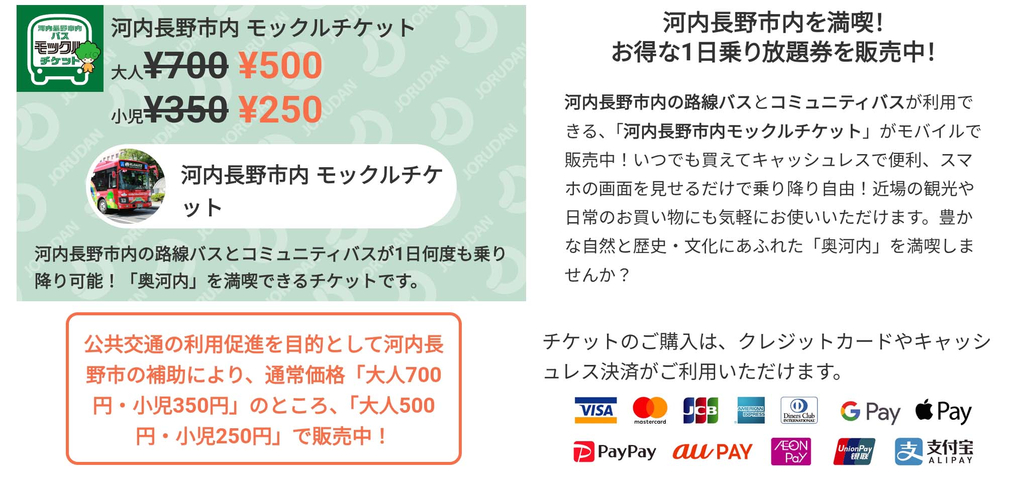 河内長野市内の南海バスとモックルバスが1日乗り放題となる「モックルチケット」をスマホアプリで購入できます。